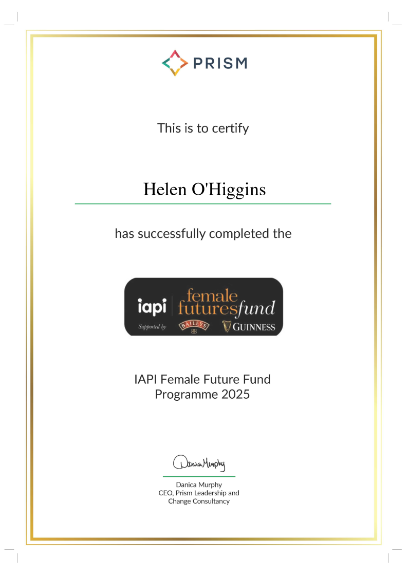 This badge celebrates your successful completion of the IAPI Female Futures Fund Programme. It recognises not only your commitment to personal and professional growth but also your dedication to developing strong, effective leadership skills. Through perseverance, reflection, and collaboration, you have demonstrated the qualities of a forward-thinking leader who strives to make a positive difference.